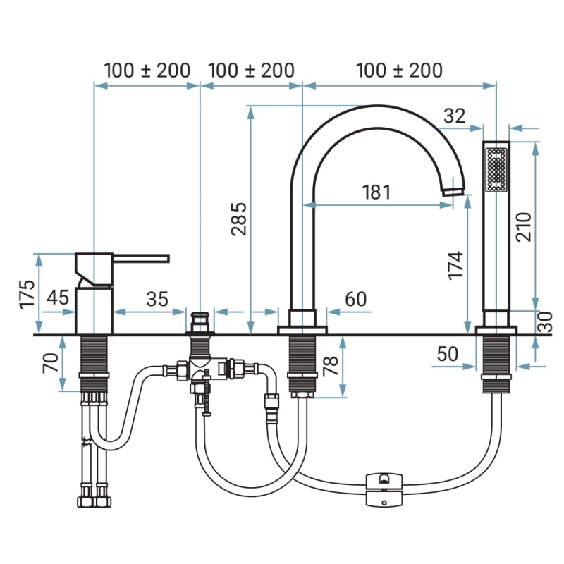 Крепление, Аэратор, Гибкая подводка, Душевой шланг, Душевая лейка