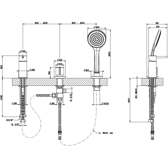 Крепление, Гибкая подводка, Душевой шланг, Душевая лейка