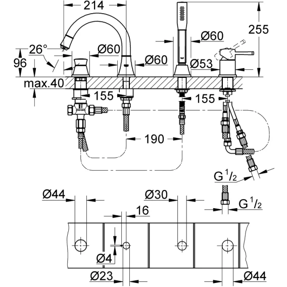 Крепление, Аэратор, Гибкая подводка, Душевой шланг, Душевая лейка