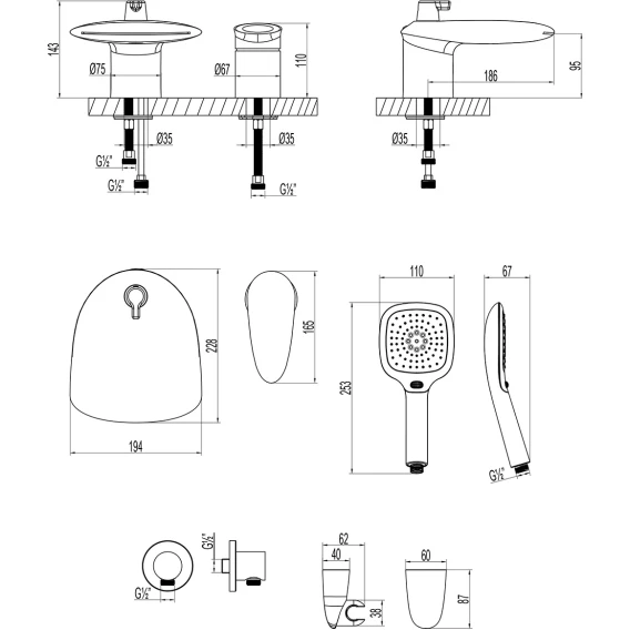 Аэратор, Гибкая подводка, Душевой шланг, Душевая лейка, Держатель для душевой лейки, Подключение для душевого шланга