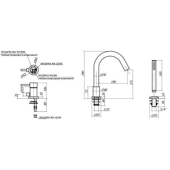 Крепление, Аэратор, Гибкая подводка, Душевой шланг, Душевая лейка, Держатель для душевой лейки