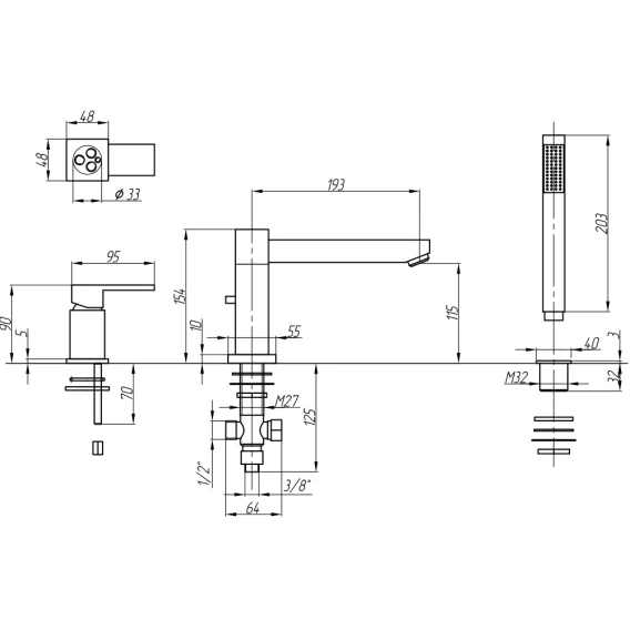Крепление, Аэратор, Душевой шланг, Душевая лейка, Держатель для душевой лейки