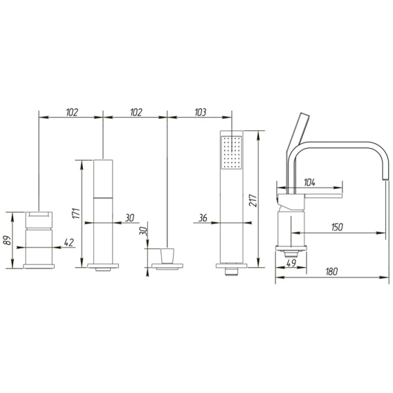 Крепление, Душевой шланг, Душевая лейка, Держатель для душевой лейки