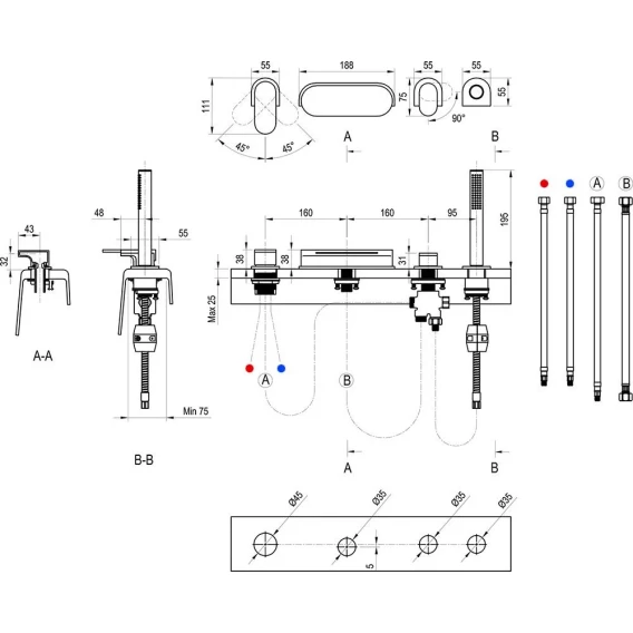 Крепление, Аэратор, Гибкая подводка, Душевой шланг, Душевая лейка