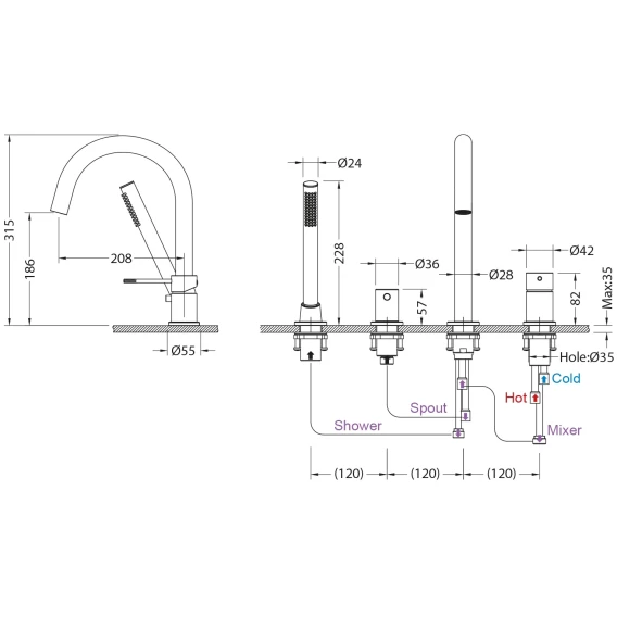 Крепление, Аэратор, Гибкая подводка, Душевой шланг, Душевая лейка