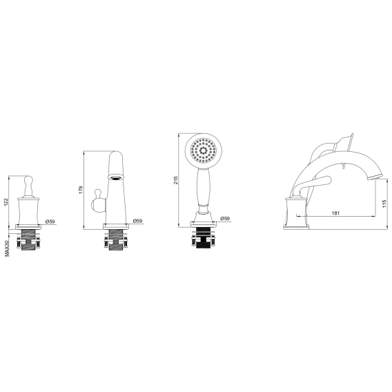Крепление, Аэратор, Гибкая подводка, Душевой шланг, Душевая лейка