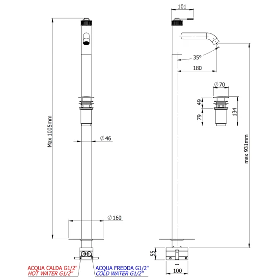 Смеситель напольный для раковины Remer Atelier AL18BG с донным клапаном, золотой матовый