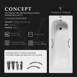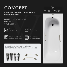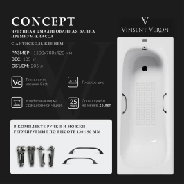 Ванна чугунная Vinsent Veron Concept VCO1607042H/VH0012BR 160x70 см, с ручками, белый