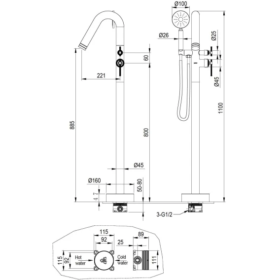 Аэратор, Душевой шланг, Душевая лейка, Держатель для душевой лейки, Скрытая монтажная часть