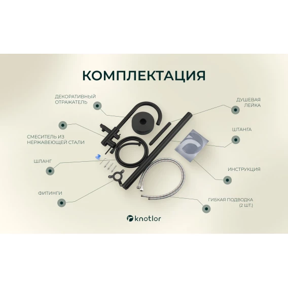 Аэратор, Гибкая подводка, Душевой шланг, Душевая лейка, Держатель для душевой лейки