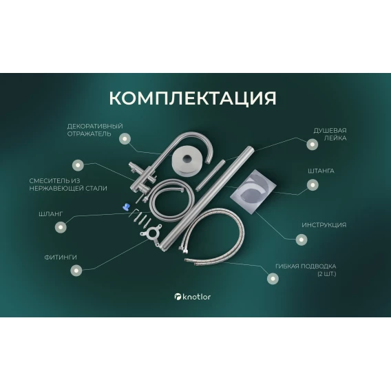 Аэратор, Гибкая подводка, Душевой шланг, Душевая лейка, Держатель для душевой лейки