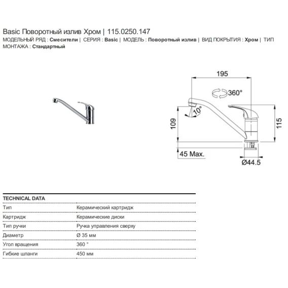 Смеситель для раковины без донного клапана Remer Kiss K11L