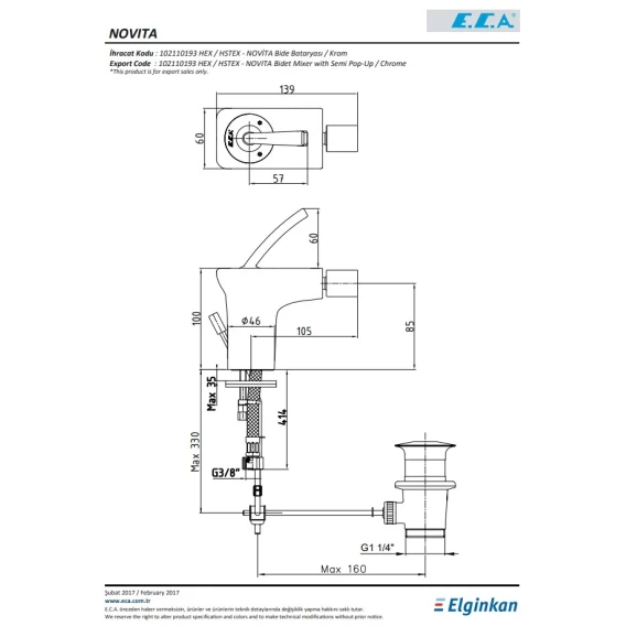 Смеситель для биде с донным клапаном E.C.A Novita 102110193HEX