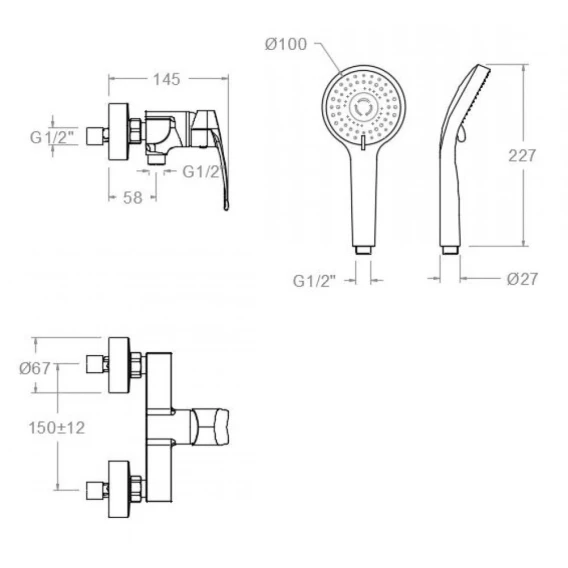 Металлическая розетка, Эксцентрики, Душевой шланг, Душевая лейка, Держатель для душевой лейки