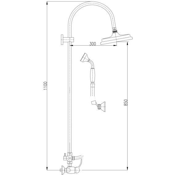 Металлическая розетка, Эксцентрики, Душевой шланг, Душевая лейка, Держатель для душевой лейки, Верхний душ, Смеситель, Кронштейн, Штанга душевая