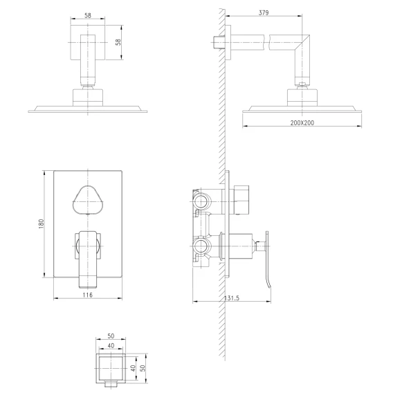 Душевой шланг, Душевая лейка, Держатель для душевой лейки, Подключение для душевого шланга, Верхний душ, Скрытая монтажная часть, Смеситель, Кронштейн