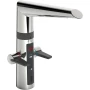 Смеситель для кухни с удобными рукоятками для горячей и холодной воды, бесконтактной функцией, дисплеем для отображения температуры воды, высоким поворотным изливом, аэратором. Расход горячей и холодной воды регулируется отдельными рукоятками. Угол поворота излива составляет 120° (заводская установка). По желанию поворот излива может быть ограничен до 60° или 80°. Для активации бесконтактной подачи воды поднесите руки к датчику. Температура воды при бесконтактной работе регулируется поворотом кольца между смесителем и изливом. Бесконтактная функция легко включается/ выключается. Работает от трансформатора 230/5 В (входит в комплект поставки). Смеситель оснащен грязевыми фильтрами.