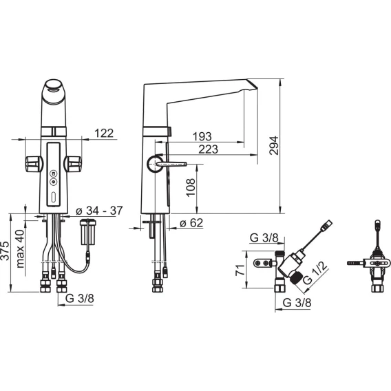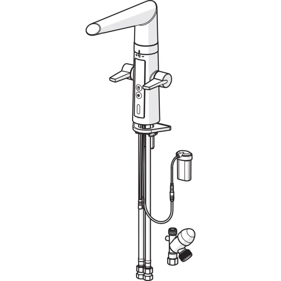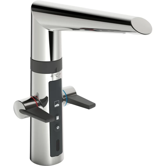 Смеситель для кухни с удобными рукоятками для горячей и холодной воды, бесконтактной функцией, высоким поворотным изливом, аэратором и смарт-клапаном для посудомоечной машины. Угол поворота излива составляет 120°. По желанию поворот излива может быть ограничен до 60° или 80°. Температура воды при бесконтактной работе регулируется поворотом кольца между смесителем и изливом. Бесконтактная функция легко включается/ выключается. Клапан для посудомоечной машины открывается нажатием на кнопку включения со световым сигналом. Клапан закрывается автоматически через 4 или 12 часов.