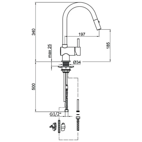 Крепление, Аэратор, Гибкая подводка, Душевой шланг, Душевая лейка
