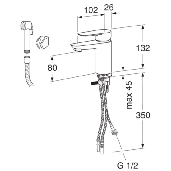 Крепление, Аэратор, Гибкая подводка, Душевой шланг, Душевая лейка, Держатель для душевой лейки