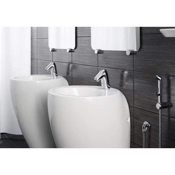 Бесконтактный смеситель для умывальника с рукояткой регулировки температуры, ручным душем Oras Bidetta и донным клапаном. Смеситель оснащен грязевыми фильтрами, обратными клапанами и датчиком с функцией автофокуса, благодаря которому не требуется дополнительная настройка параметров. Ограничитель расхода воды (6 л/мин) позволяет экономить воду. Работает от трансформатора 230/12ВАльтернатива: шинный трансформатор 199275. К одному трансформатору могут быть одновременно подключены до пяти смесителей.