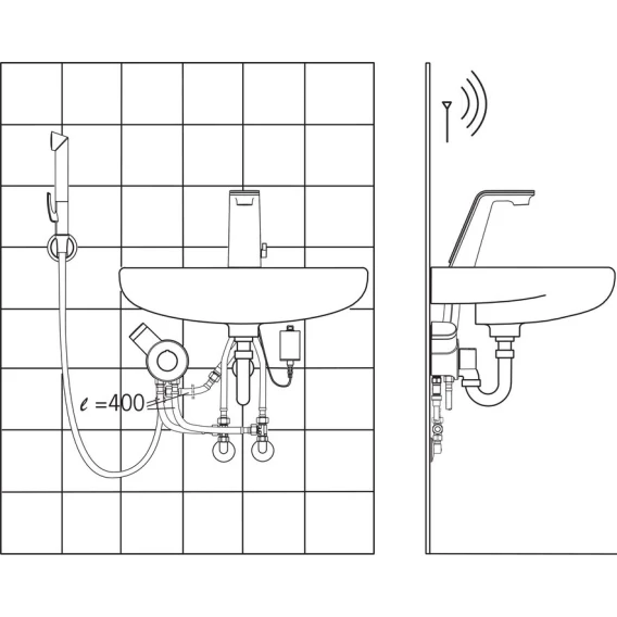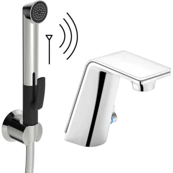 Смеситель открывается мягким нажатием на верхнюю поверхность, после чего поток воды открыт в течение 6 сек. (Заводская настройка) При нажатии на верхнюю часть смесителя в течение одной секунды поток воды остается открытым в течение одной минуты. При нажатии на верхнюю часть смесителя в течение четырех секунд, смеситель запускает режим очистки. Поток воды остается закрытым в течение 20 секунд. Удобный в использовании регулятор температуры на рукоятке используется также как регулятор потока воды. Работает от батареи 3В.