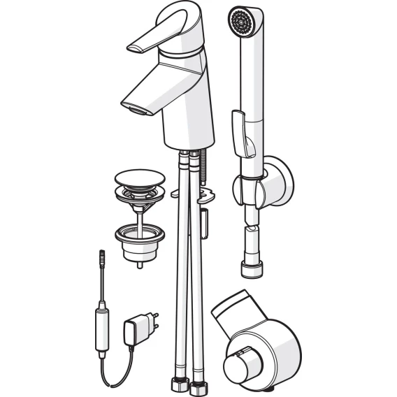 Крепление, Аэратор, Гибкая подводка, Донный клапан, Душевой шланг, Душевая лейка, Держатель для душевой лейки