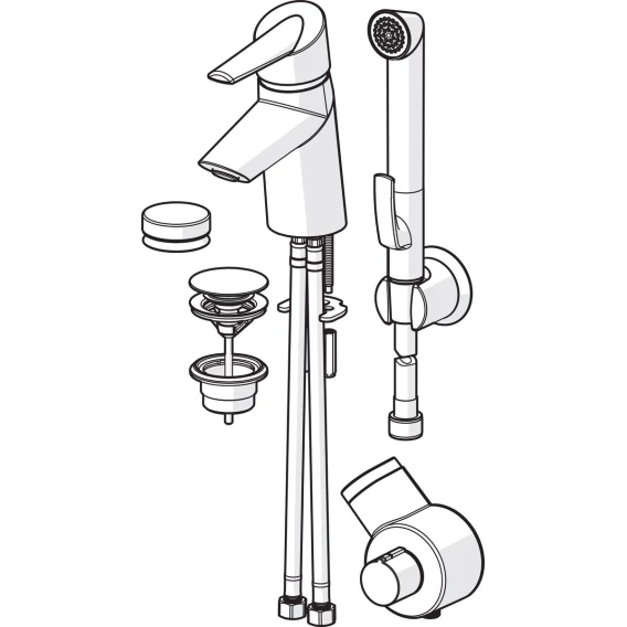 Крепление, Аэратор, Гибкая подводка, Донный клапан, Душевой шланг, Душевая лейка, Держатель для душевой лейки