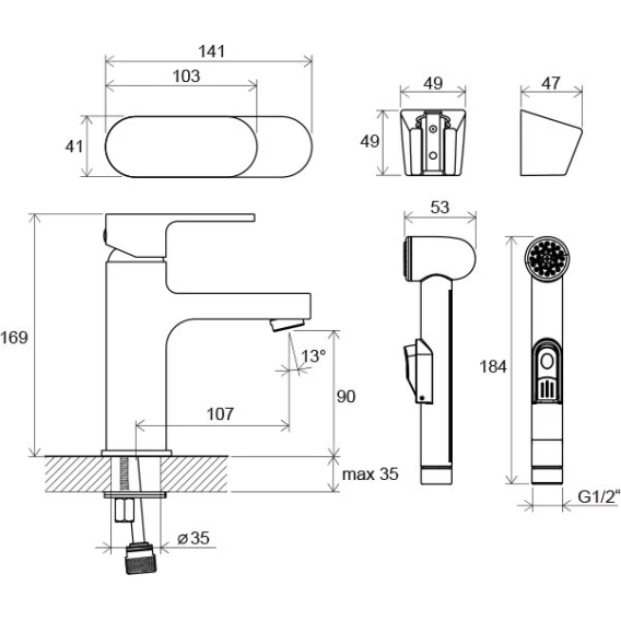 • исполнение: с ручным гигиеническим душем и настенным держателем