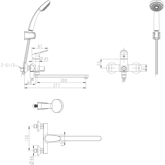Аэратор, Металлическая розетка, Эксцентрики, Душевой шланг, Душевая лейка, Держатель для душевой лейки