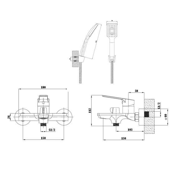 Аэратор, Металлическая розетка, Эксцентрики, Душевой шланг, Душевая лейка, Держатель для душевой лейки