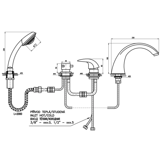 Крепление, Гибкая подводка, Душевой шланг, Душевая лейка