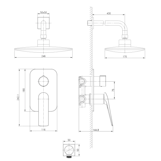 Душевой шланг, Душевая лейка, Держатель для душевой лейки, Подключение для душевого шланга, Верхний душ, Скрытая монтажная часть, Смеситель, Кронштейн
