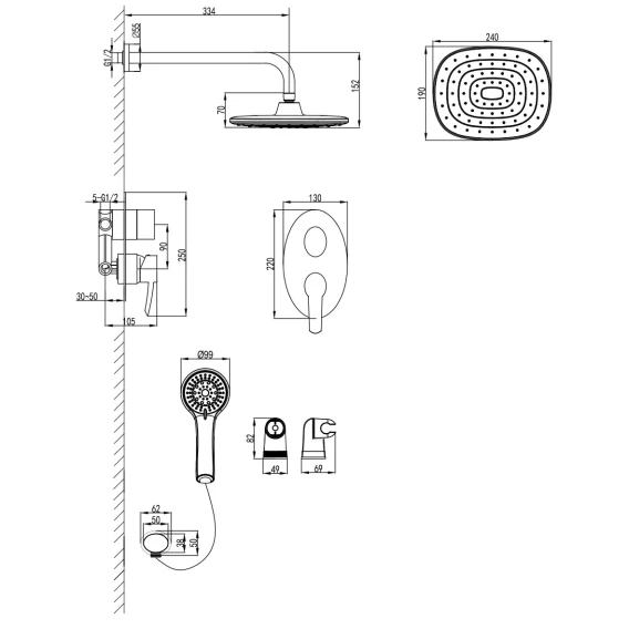 Душевой шланг, Душевая лейка, Держатель для душевой лейки, Подключение для душевого шланга, Верхний душ, Скрытая монтажная часть, Смеситель, Кронштейн