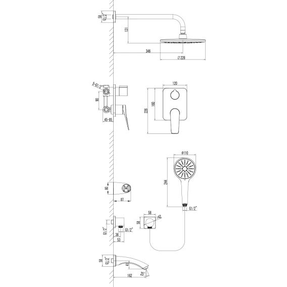 Аэратор, Душевой шланг, Душевая лейка, Держатель для душевой лейки, Подключение для душевого шланга, Верхний душ, Излив, Скрытая монтажная часть, Смеситель, Кронштейн