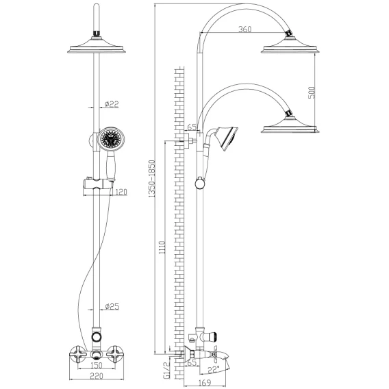 Аэратор, Металлическая розетка, Эксцентрики, Душевой шланг, Душевая лейка, Держатель для душевой лейки, Верхний душ, Смеситель, Кронштейн, Штанга душевая