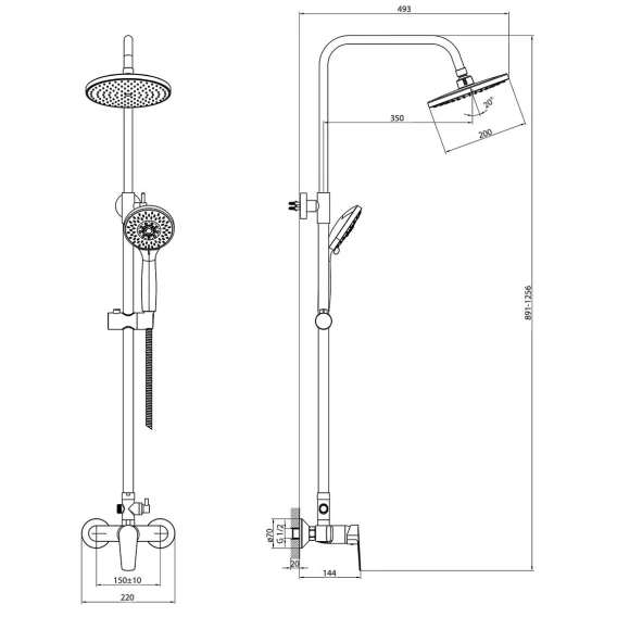 Металлическая розетка, Эксцентрики, Душевой шланг, Душевая лейка, Держатель для душевой лейки, Верхний душ, Смеситель, Кронштейн, Штанга душевая