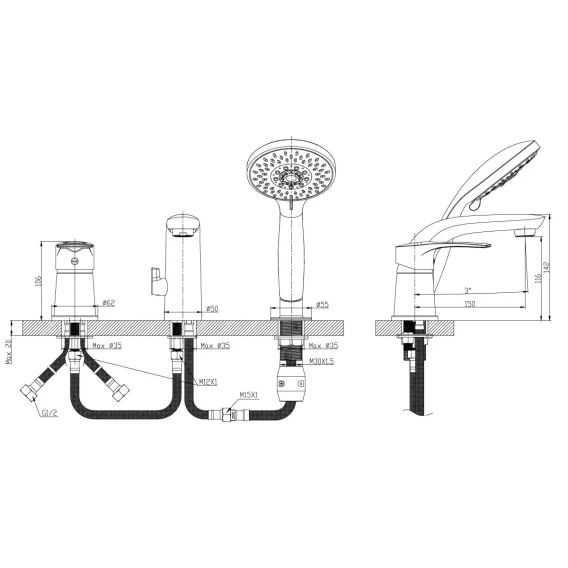 Крепление, Аэратор, Гибкая подводка, Душевой шланг, Душевая лейка