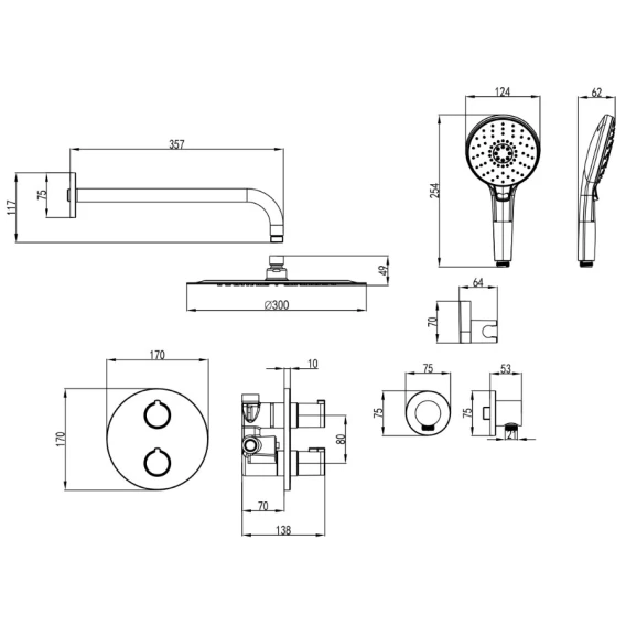 Душевой шланг, Душевая лейка, Держатель для душевой лейки, Подключение для душевого шланга, Верхний душ, Скрытая монтажная часть, Кронштейн, Термостат