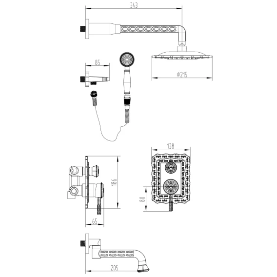 Аэратор, Душевой шланг, Душевая лейка, Подключение для душевого шланга с держателем, Верхний душ, Излив, Скрытая монтажная часть, Смеситель, Кронштейн