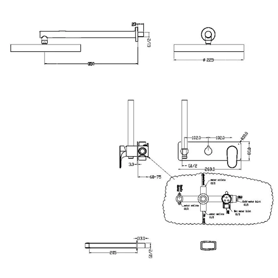 Душевой шланг, Душевая лейка, Подключение для душевого шланга с держателем, Верхний душ, Излив, Скрытая монтажная часть, Смеситель, Кронштейн