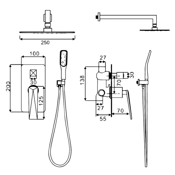 Душевой шланг, Душевая лейка, Подключение для душевого шланга с держателем, Верхний душ, Скрытая монтажная часть, Смеситель, Кронштейн