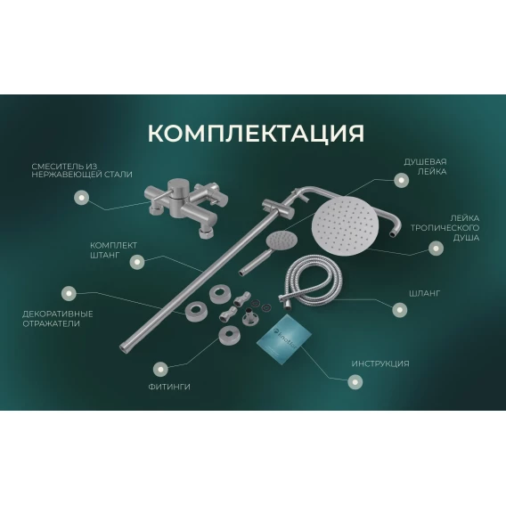 Металлическая розетка, Эксцентрики, Душевой шланг, Душевая лейка, Держатель для душевой лейки, Смеситель, Кронштейн, Штанга душевая