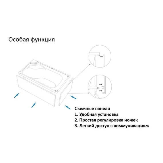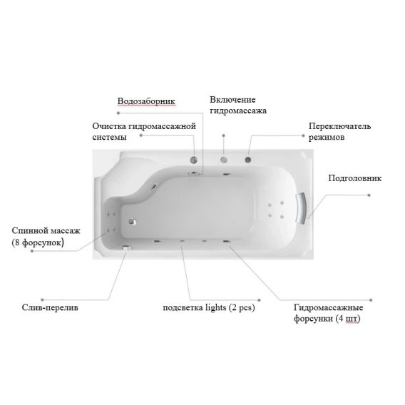 Душевой шланг, Душевая лейка, Держатель для душевой лейки, Полочка, Ручки, LED подсветка, Подсветка, Верхний душ, Bluetooth, Подголовник, Сиденье, Радио, Смеситель, Слив-перелив, Штанга душевая