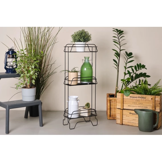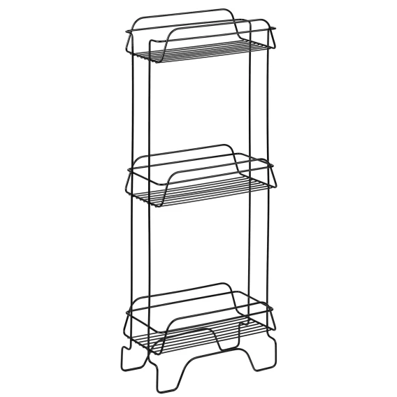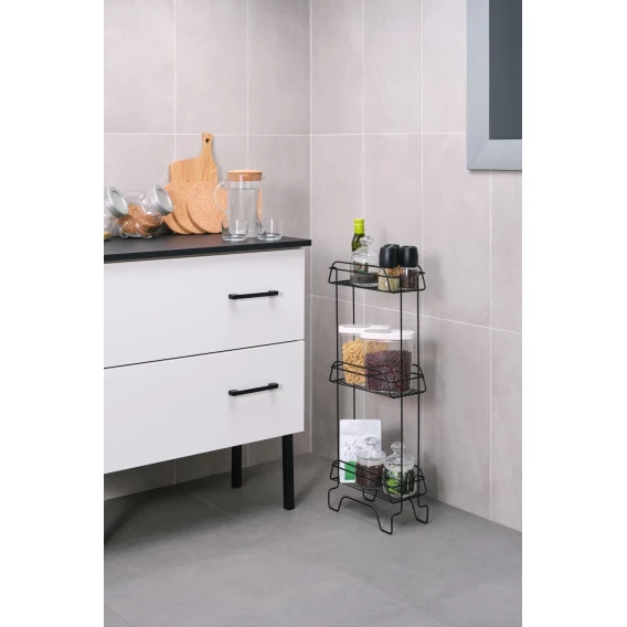 Трёхъярусный напольный стеллаж из стали черного цвета. Размеры: высота 78,5 см, длина 15 см, ширина 30 см. Обладает отличными антикоррозийными свойствами, благодаря чему стеллаж не ржавеет и не подвергается вредному воздействию косметических средств и бытовой химии. Прочный сплав позволяет изделию выдерживать до 20 кг и не деформироваться. Сделан на российском производстве с соблюдением государственных стандартов. Узкий стеллаж поместится в ванной комнате небольшого размера, впишется в любой интерьер и станет отличной системой хранения для большой семьи. Также его можно использовать в других помещениях: например на кухне или в прихожей.