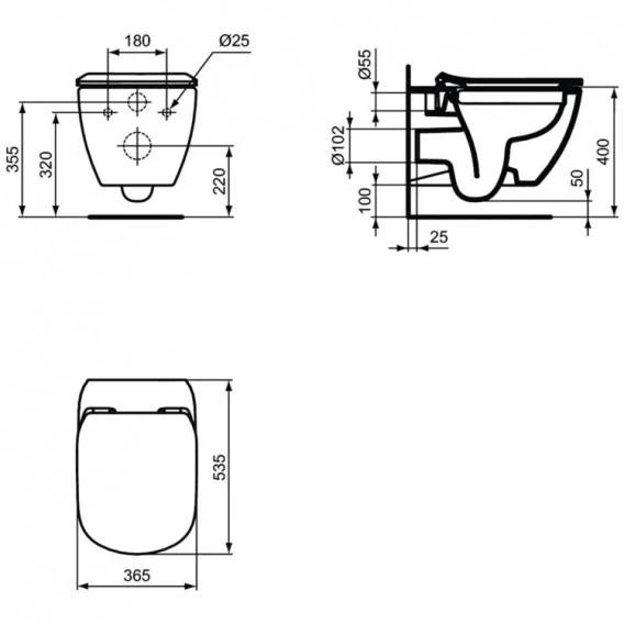 • безободковый подвесной унитазом T355101 с сидением и крышкой с функцией плавного закрытия T352701, дюропласт;