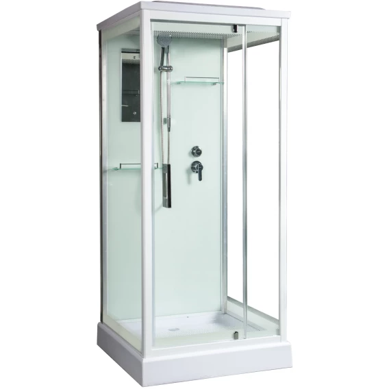 Душевой шланг, Душевая лейка, Держатель для душевой лейки, Полочка, Верхний душ, Металлический каркас, Поддон, Смеситель, Сифон, Штанга душевая, Ножки, Зеркало
