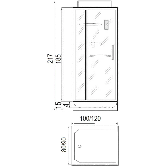 Душевой шланг, Душевая лейка, Держатель для душевой лейки, Полочка, Верхний душ, Металлический каркас, Поддон, Смеситель, Сифон, Штанга душевая, Ножки, Зеркало