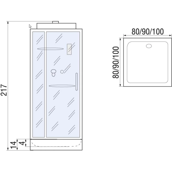 Душевой шланг, Душевая лейка, Держатель для душевой лейки, Полочка, Верхний душ, Металлический каркас, Поддон, Смеситель, Сифон, Штанга душевая, Ножки, Зеркало