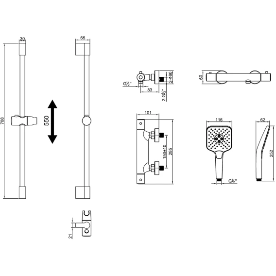 Металлическая розетка, Эксцентрики, Душевой шланг, Душевая лейка, Держатель для душевой лейки, Штанга душевая